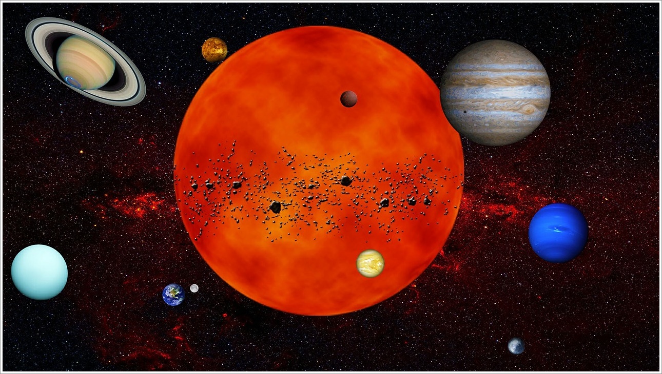 태양계는 크게 내행성, 소행성대, 외행성의 세 부분으로 나눌 수 있습니다. 내행성으로 불리는 지구의 행성들 중 일부는 수성, 금성, 지구, 화성입니다. 바깥을 공전하는 외행성은 가스 행성으로 이루어져 있으며, 목성, 토성, 천황성, 해왕성으로 이루어져 있습니다. 해왕성 너머에는 카이퍼대가 존재하고 있고, 가장 바깥쪽에는 오르트 구름이 최대 1광년 거리로 뻗어 있습니다.